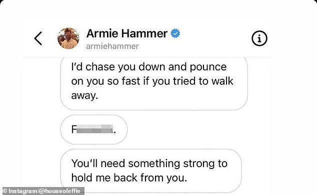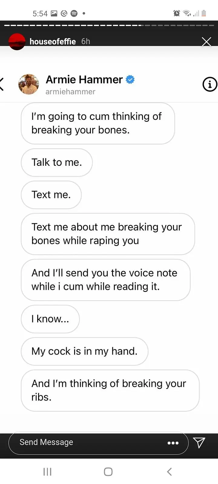 11日,ins账户@house of effie在网上指控艾米锤有食人、强奸、发送淫秽色情ins私信的行为。并迅速放出一系列截图和照片证明,对话发生的时间据说是2016-2020年之间。