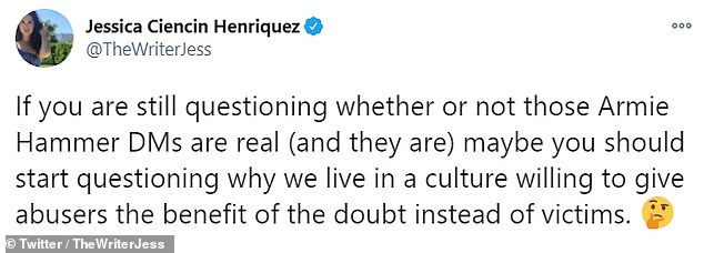 去年9月被拍到和艾米锤约会的女作家jessica ciencin henriquez,力挺爆料人,她在推特上声称,她相信爆料人分享的截图是真实的: