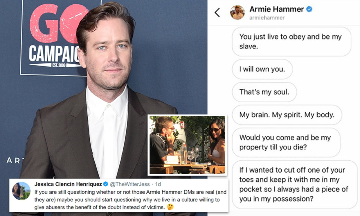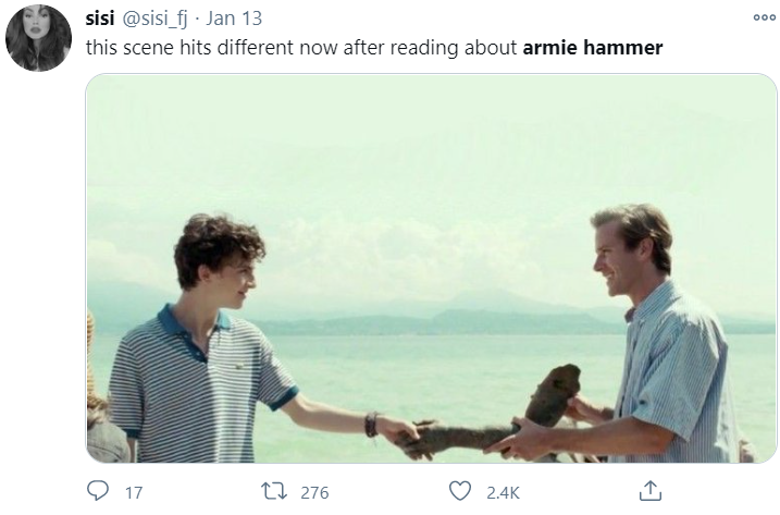 连续三天,推特上和ins上的影迷都处于炸锅状态。因为1月11日,外网突然有几个账号爆料《以你的名字呼唤我》的男主角之一armie hammer(外号“锤子”“艾米锤”),喜欢性虐,喝人血,甚至是一名食人族...