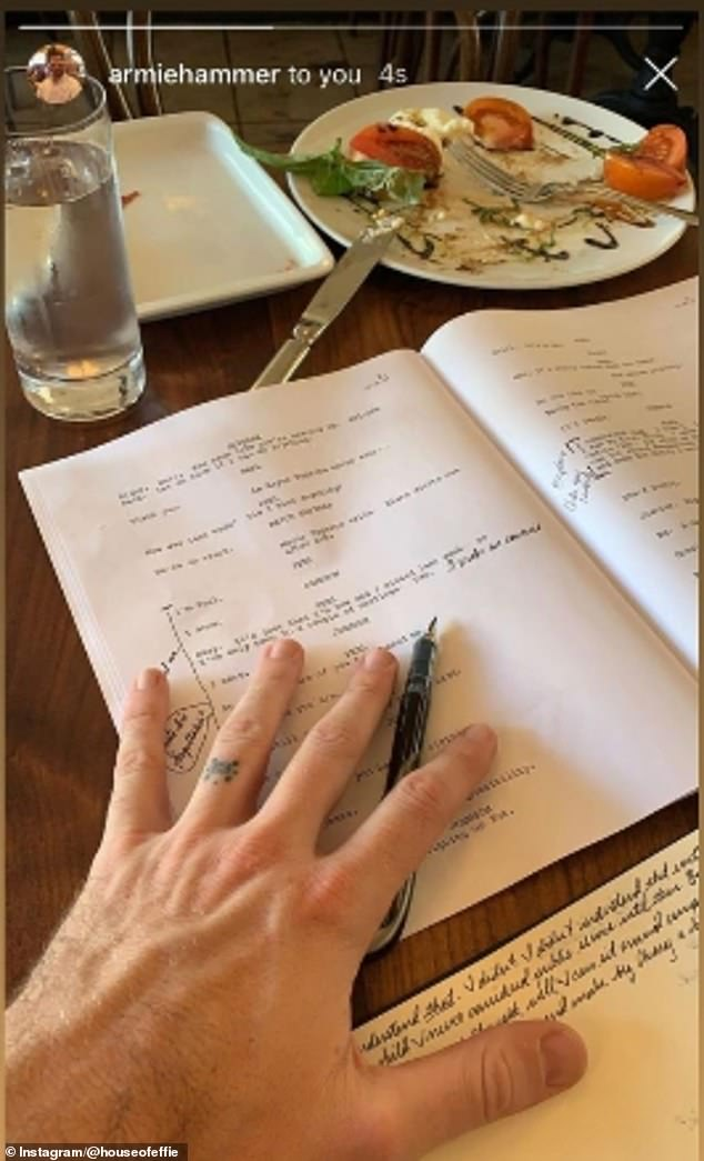 照片中是一张餐桌上一个男人的手,可以看到左手无名指的位置有一个文身,桌上貌似是剧本。这是一条ins私信。