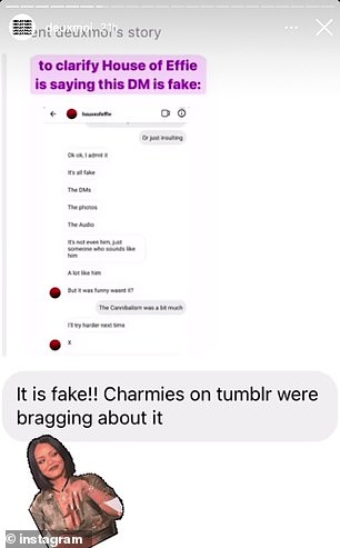 而且很快流传出了一张“辟谣图”,截图中显示:爆料账号@house of effie 对一名网友承认一切都是自己编造的。