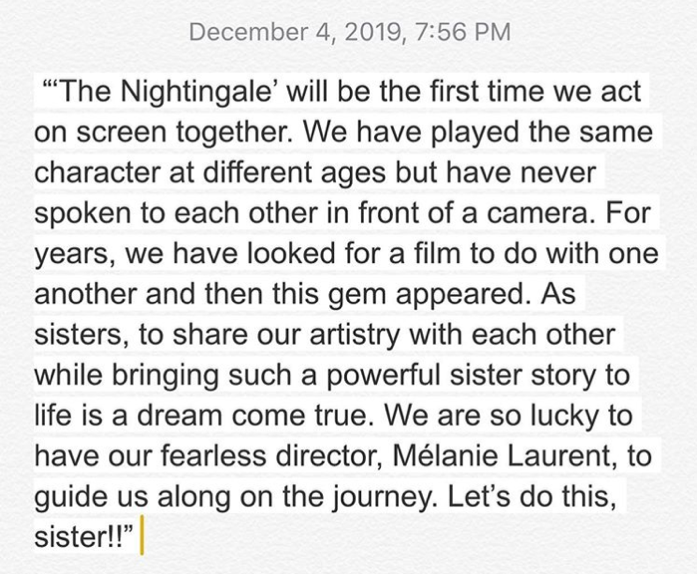 她们即将在电影《夜莺》中饰演亲姐妹,这是她们第一次在大银幕上演对手戏。