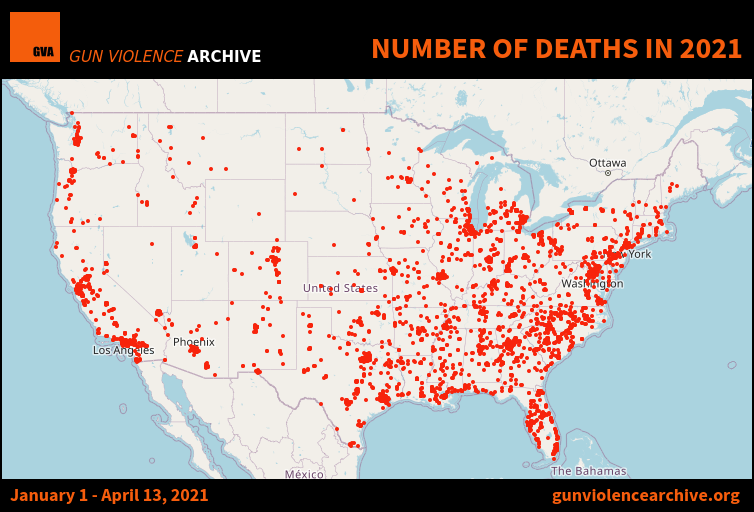2021年1月1日至4月13日美国枪击案死亡分布地图(图源:gun violence archive)