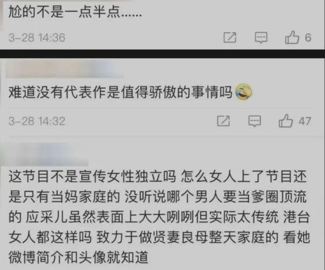 有人听到这话不乐意了,愤怒地敲下一句:“节目不是宣传独立女性吗,这女人上了节目还整天当妈家庭的,其实还是贤妻良母,港台女星都这样。”