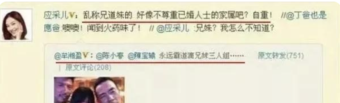 终于,在牟湘盈发出和陈小春的合照后,应采儿忍无可忍,怒怼:“我怎么不知道你俩是兄妹?乱称兄道妹的,不尊重已婚人士的家属,自重!”