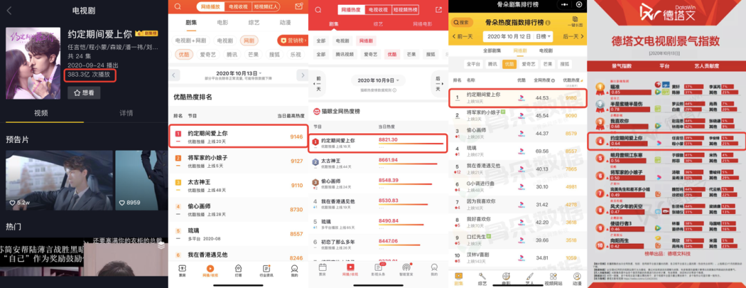 开播首周站内热度一路飙升最高达9600,登上优酷平台多个榜单第一,冲上猫眼全网热度榜第二、抖音剧集榜第三等成绩,让这部剧有了一个好的开始;如今剧集收官,微博相关主话题达到9.5万讨论、1.5亿阅读,抖音《约定期间爱上你》站内播放达383.3亿,#约定期间爱上你#话题视频达到12亿次播放,也再次证明了在10月甜宠剧扎堆的情况下,《约定期间爱上你》的脱颖而出。