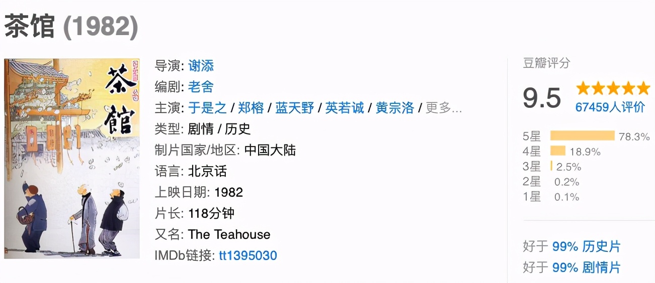 1982年,由谢添执导,于是之、郑榕、蓝天野等话剧演员主演的《茶馆》上映,成了不可复制的经典,荣获中国电影金鸡奖特别奖等,至今豆瓣评分高达9.5分,很多网友说:“结尾当年看哭我。”