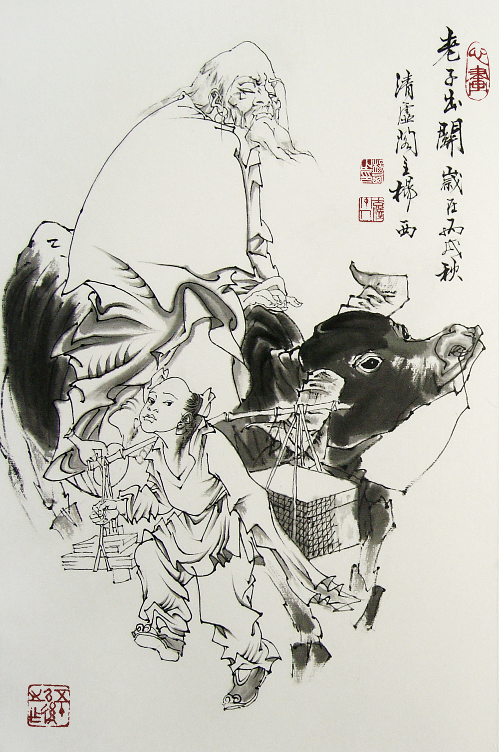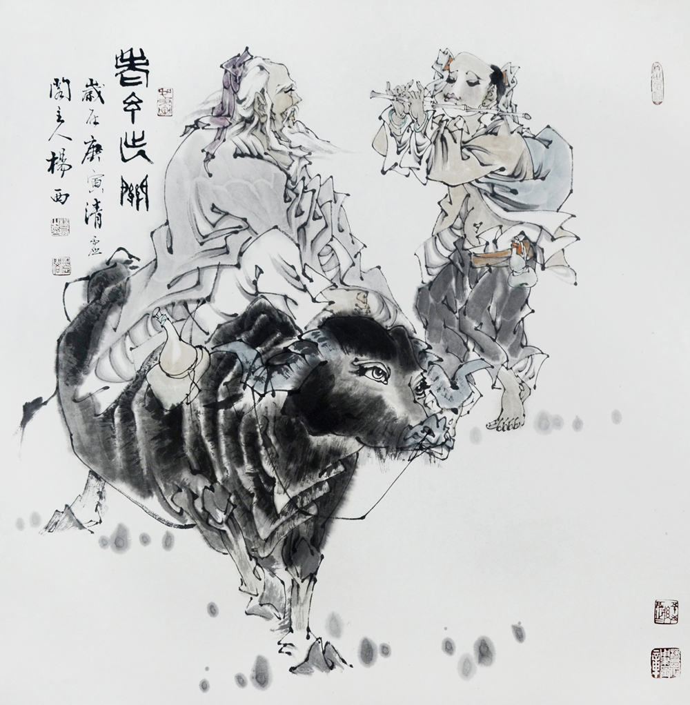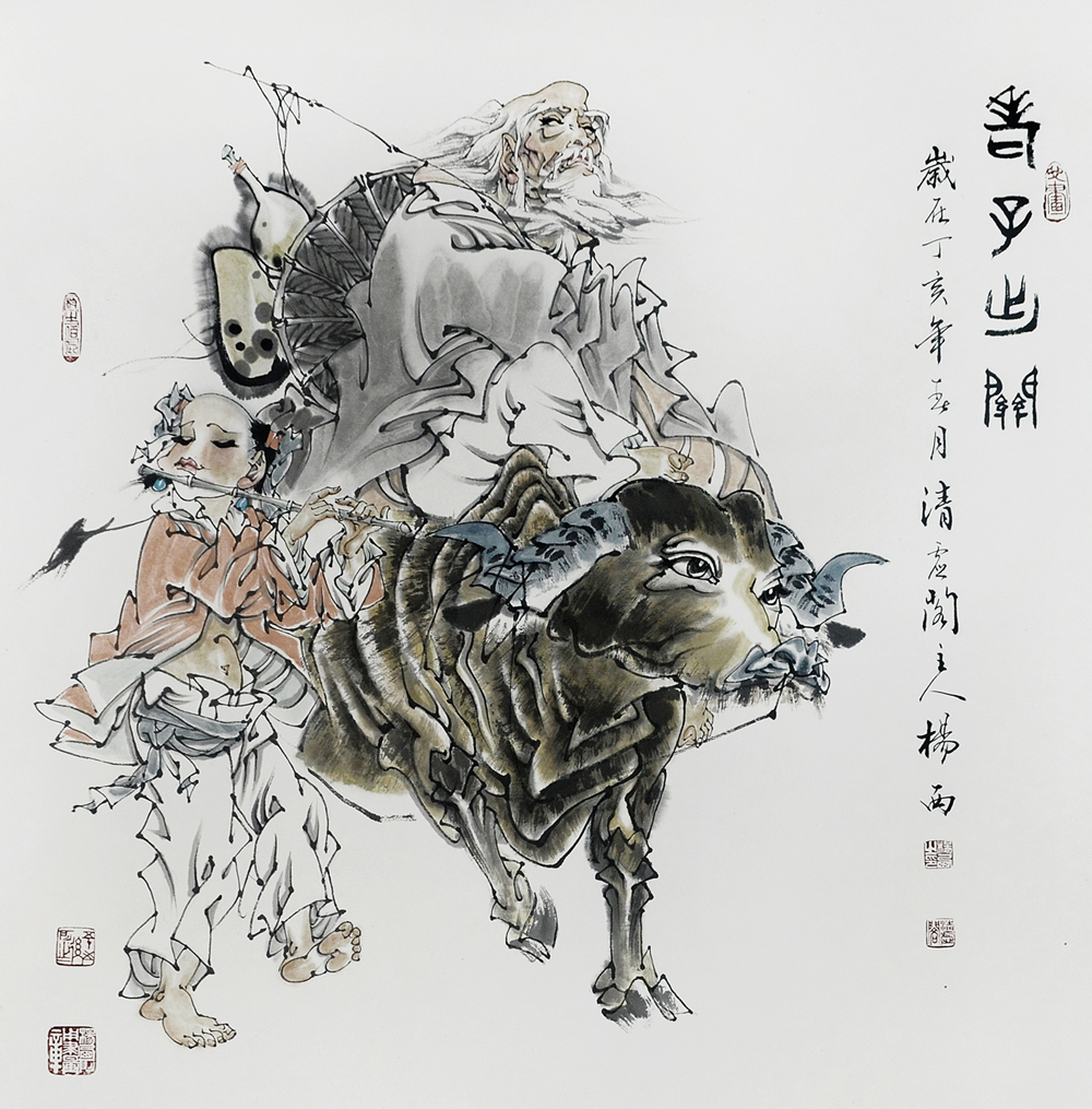 这几幅《老子出关》是我经常画的形式,一个画家在进行创作的时候,需要根据历史传说和故事内容进行构思、构图,探索画中的用笔用墨,反复地锤炼才能画出满意的作品。我经过长时间的努力,看了很多文人的作品,终于从陈洪绶、任伯年的作品中悟出点门道,取其线描中的装饰性,结合钉头鼠尾描和行云流水描,形成我自己的线描语言。虽然有些地方还不甚满意,发几张于此与同行们共同探讨。
