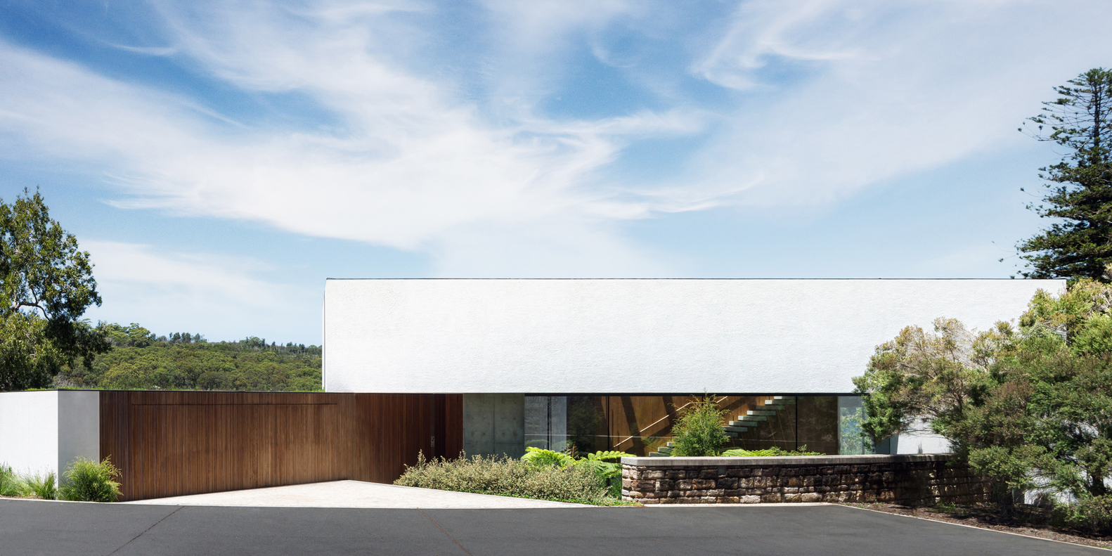 该场地的东、北和西都被邻居所包围,但在南边,可以欣赏到柯林斯海滩周围的海湾和远处海港的令人难以置信的一览无余的景色。在将南部和周围丛林的景色框起来的同时,这所房子还必须确保邻居的隐私,同时捕捉到被其他房子、陡峭的山丘和现有的大松树阻挡的北方阳光。