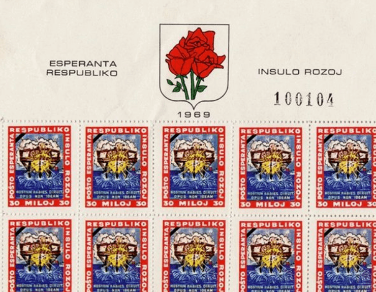 玫瑰岛共和国真实发行的邮票,描绘人工岛被炸的场面