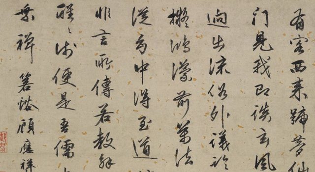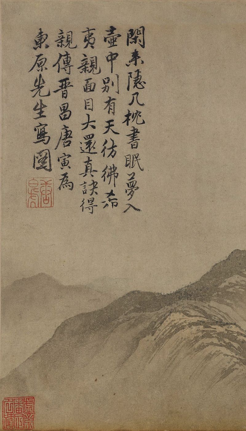 此《梦仙草堂图》卷题作:晋昌唐寅为东原先生写图。画卷将“枕书眠”的真实表现引伸到“梦入壶中”的幻想境界,将真与幻,现实与想象相结合来构成富有幻想色彩的画意,使观赏者产生梦幻境界的联想。此卷现藏于弗利尔美术馆,卷后有顾应祥、许相卿、僧子山、翁桂、费念慈等诗文题跋。