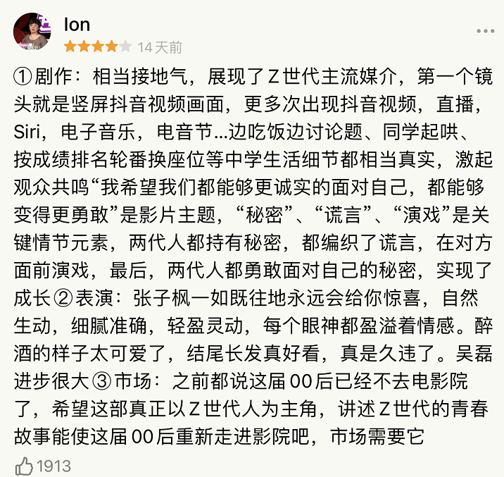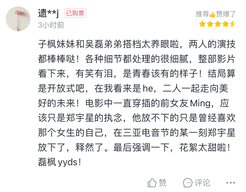 她认为“电影里有笑有泪,是青春该有的样子,结局是开放式,在我看来二人一起走向了美好的未来!”