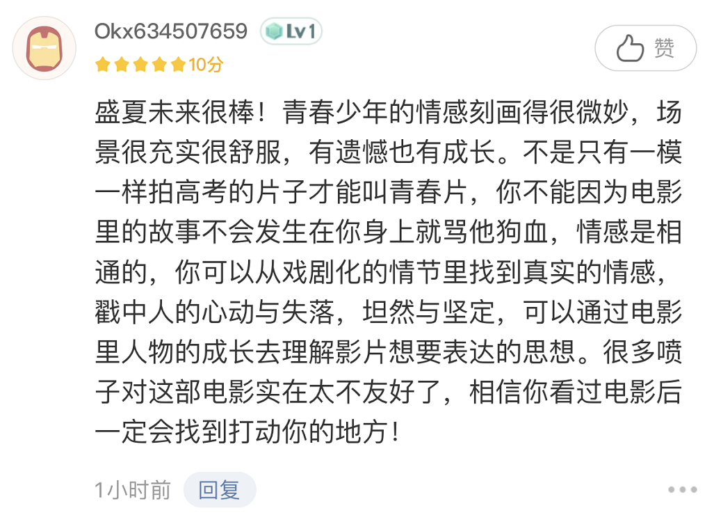 网友“okx”表示,《盛夏未来》很棒,青春少年的情感刻画很微妙,场景很充实很舒服,很遗憾也有成长。