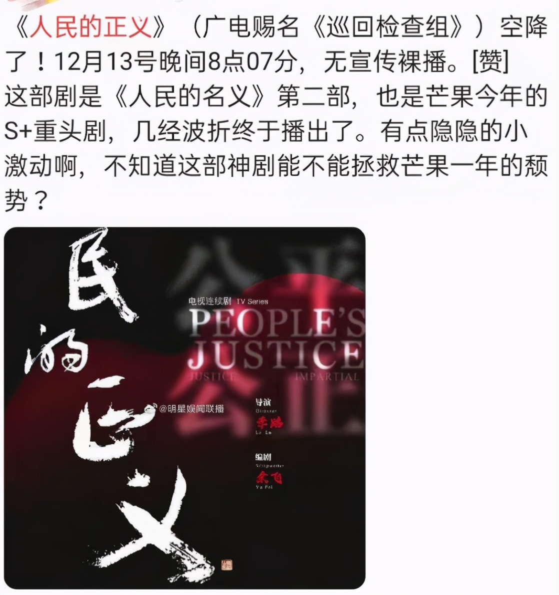 就在12月13日晚上8点,《人民的正义》再次改名为《巡回检查组》,在没有任何宣传和预告的情况下,在芒果台悄悄播出了。