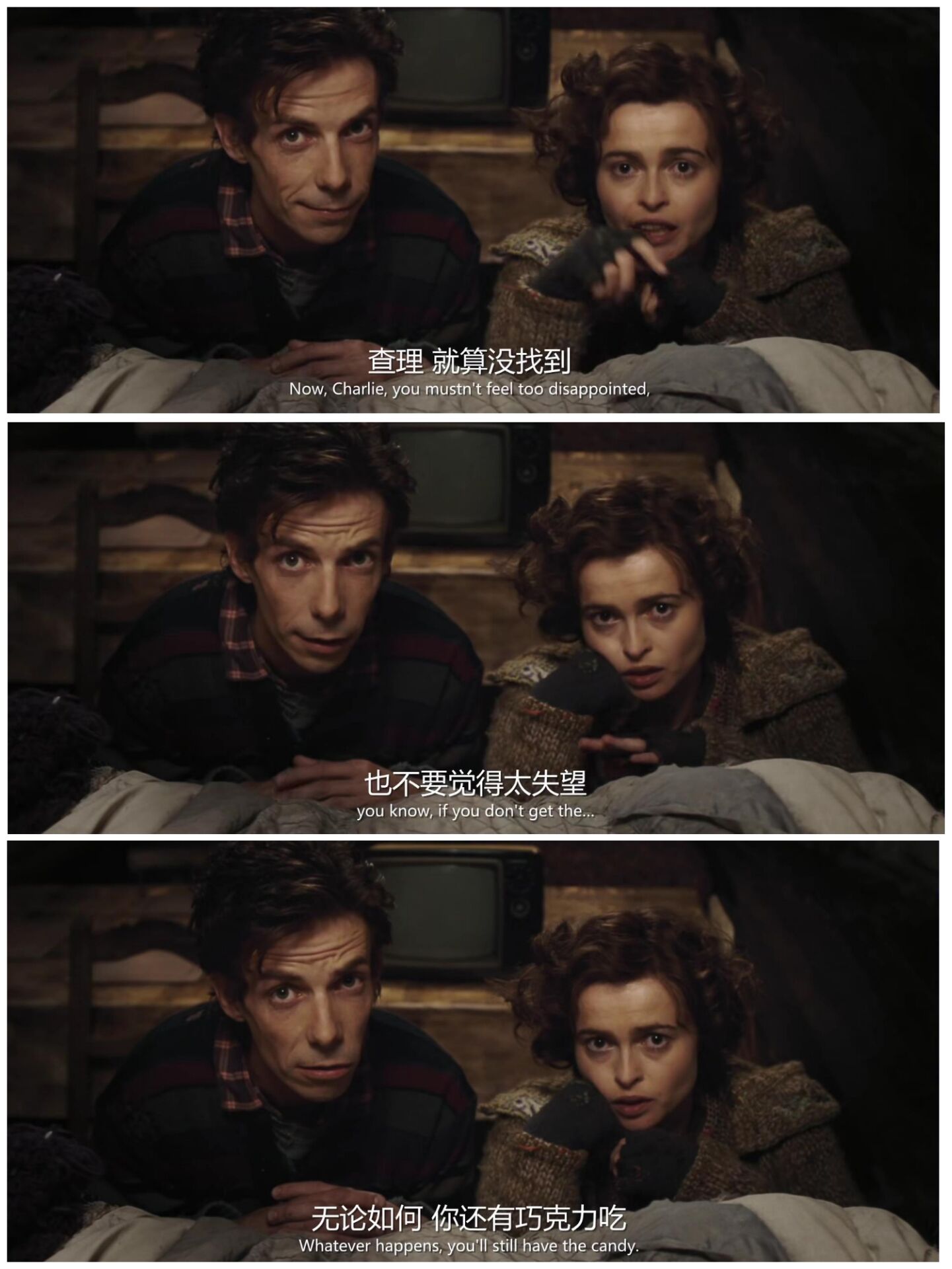在无数巧克力中得到那带有金奖券的巧克力本就无异于大海捞针。但是一家人还是一起看着查理拆开巧克力。我们可以对难以想象但存在的一切抱有希望,但是不要忘了知足常乐,也不要忘了沿途的风景和当初对它执着的快乐。