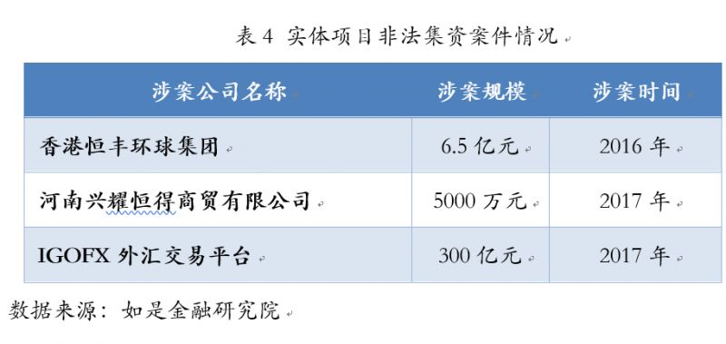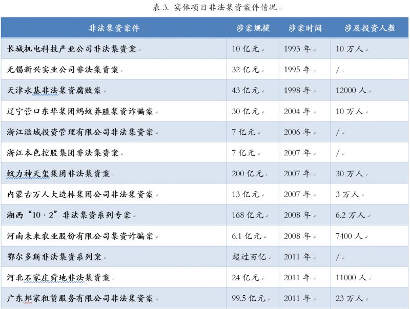 实体项目非法集资与前两种非法集资套路相似,只是投资标的不同。实体项目非法集资表面假借实体项目进行融资,但实体项目的资质往往是包装出来的,金玉其外败絮其中。实体项目非法集资具有案件多发、涉案规模大、涉及投资人数多的特点,曾经骇人听闻的蚁力神案、吴英案、小姑娘案、鄂尔多斯非法集资案等均在此列。