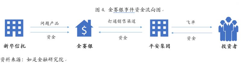 这一事件的背后,存在着一条“有毒资产”转嫁链条:信托公司把信托贷款、债权等问题产品转给第三方私募接盘;私募公司金赛银通过动员平安员工“接飞单”等方式,打通了平安集团的销售渠道,募得巨额资金,最终挪作它用,导致原本就存在问题的资产链条断裂。
