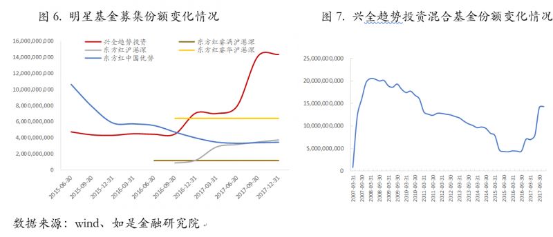 从图6列举的五只明星基金的募集份额情况来看,东方红睿满沪港深、东方红睿华沪港深、东方红沪港深、东方红中国优势的募集份额均维持得十分平稳,其中前两只基金的份额在成立以来均维持不变,东方红中国优势的份额甚至还有下降。兴全趋势投资混合基金的募集份额虽然在近两年来有较快的增长,但其募集份额规模较更早时候的2008年来看,也有明显的下滑;2008年3月31日,该基金的募集份额一度高达20536270957份。