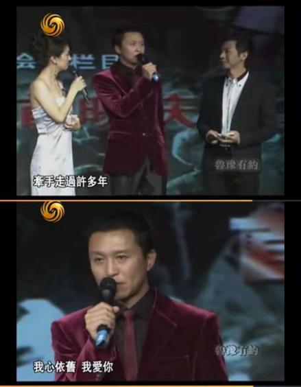 台上主持人念完信,吴刚毫不犹豫的喊出了爱人的名字,并动情的说:"牵手走过许多年,我心依旧,我爱你。"