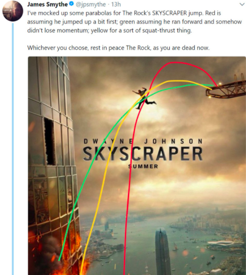然而,这张海报却被广大网友玩坏了,大家纷纷打开脑洞,对巨石强森的跳跃路线进行了猜想和设计,一时间传送门、降落伞什么的都上来了,真是存心想让他掉下去的节奏。网友们还对自己的想法表示非常满意,称没毛病。最有意思的事,还有一位网友拿出几位科学家当挡箭牌,写到:”阿波罗尼奥斯:网友画的线是对的;阿基米德:支持网友;牛顿:两位前辈说的对”。不知道强森本人看了会作何感想。