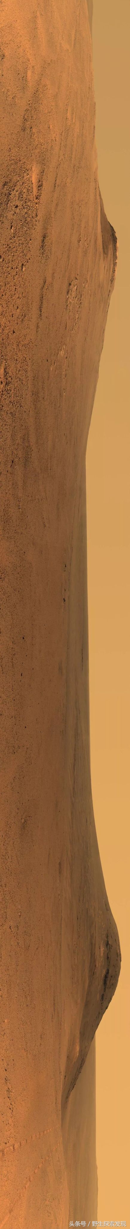- 请将手机横屏观看,机遇号拍摄的火星毅力谷全景,最右侧可见火星车的车迹