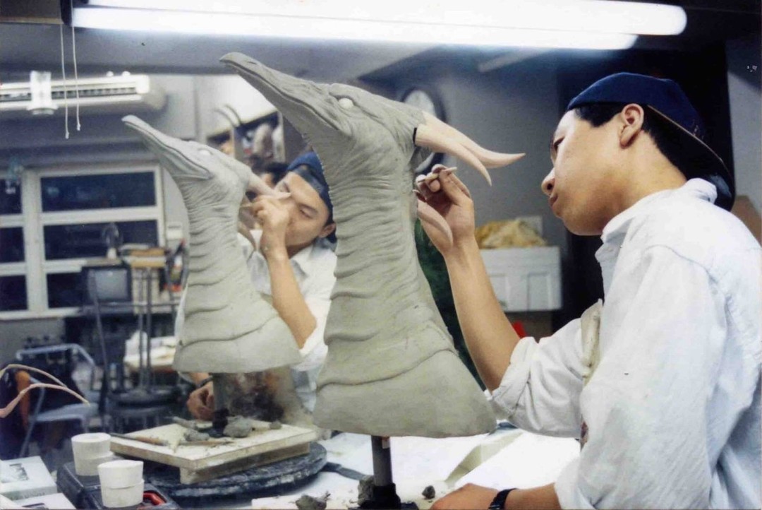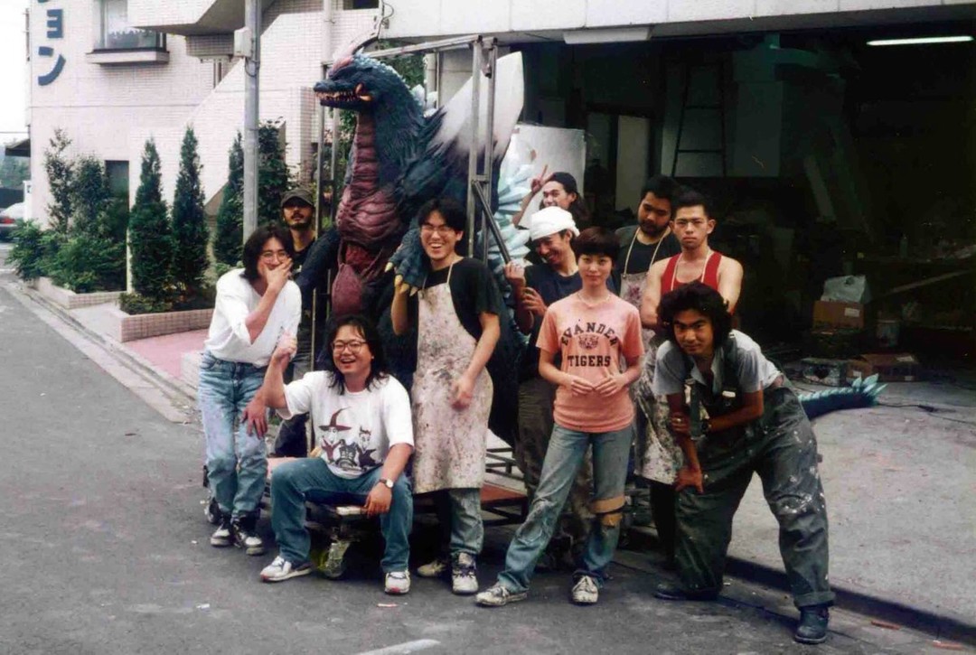 1995,打着“哥吉拉之死”旗号的电影《哥吉拉vs戴斯特洛伊亚》的怪兽设计稿出来了,怪兽戴斯特洛伊亚在定稿中是有着三种形态的怪兽,并且设计风格是一样的,对统一感的要求很高,若是按以前的体制一个个来恐怕制作效率和效果都不好,因此共计22人在40天内强行加班终于完成了一口气戴斯特洛伊亚3个形态的皮套。