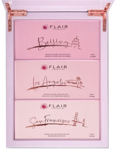 美国flairchocolatier公司在2019年秋季推出了一系列以全球大城市为主题的巧克力。简洁的城市名称与简笔画风格的地标性建筑图案组成了对于一个城市的最固化印象。不仅成为本地居民表达地域情感的极好载体,也成为更多消费者通过产品寻找知己、同乡的渠道。