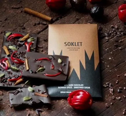 印度soklet公司用世界上最辣的辣椒——阿萨姆的the bhut jolokia(俗称鬼胡椒),开发出一款玛雅风格的巧克力,产品完美平衡了甜味和辣味;明亮的果香与可口的酸度相结合,形成了这款巧克力的标志性风味。