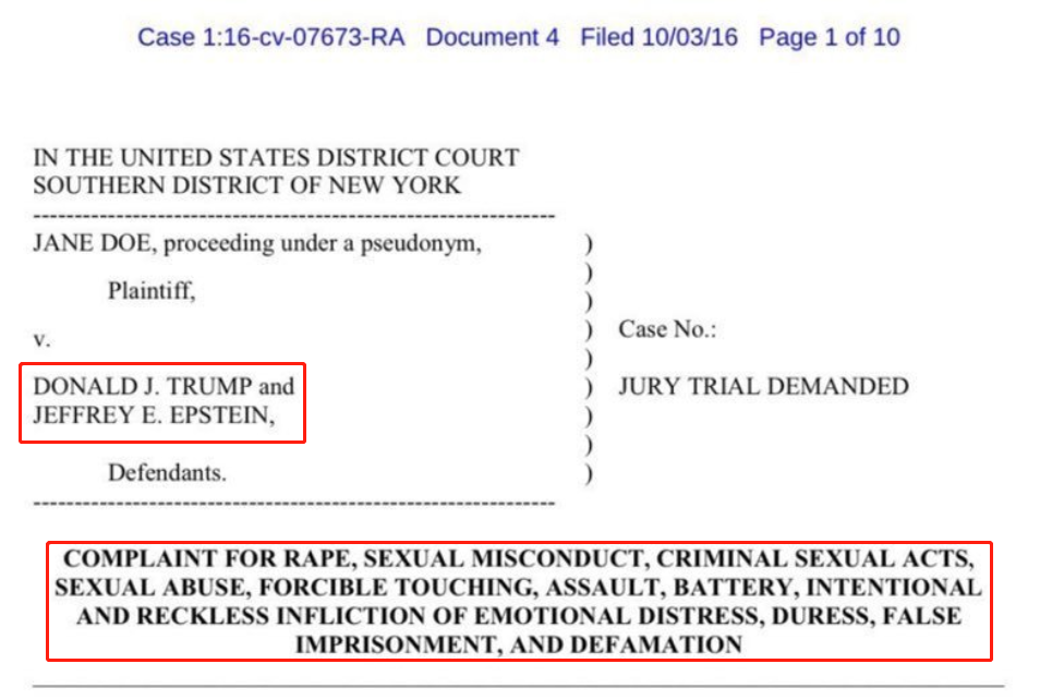 文件显示,16年轰动一时的爱泼斯坦案中,特朗普也被指控性侵13岁少女,并附目击证人供词。