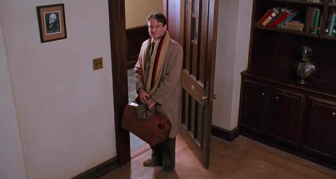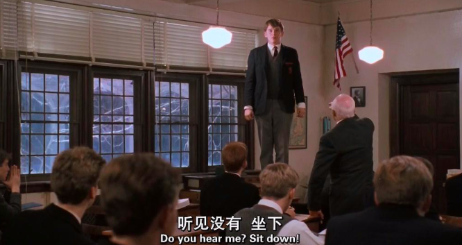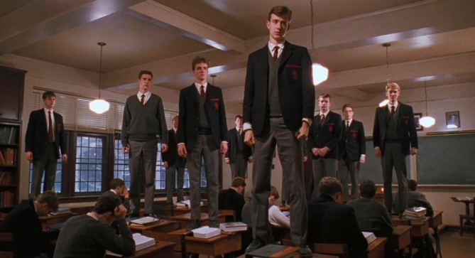 在第一堂文学课上,基汀老师吹着口哨进来,然后带领着这些学生们走到校史资料的走廊。看着那些已经作古的校友们,“死亡”这个主题,再次从基汀老师老师向学生们传达出来:“我们是蛆虫的食物,在这儿的每一个人,有一天都会停止呼吸,变冷、死亡。”