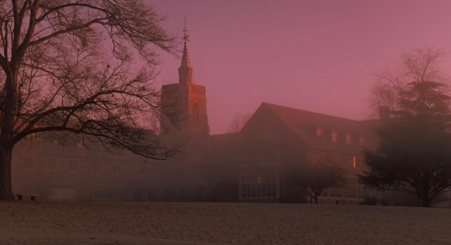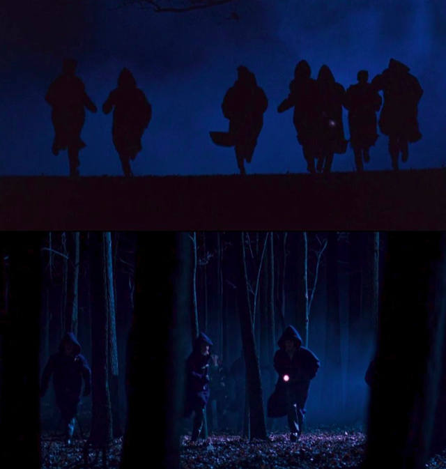 电影采用冷色调,这就奠定了影片的整个基调。当夜晚,学生们在黑暗的夜色中,身披斗篷,拿着手电筒,伴随着神秘的苏格兰风笛,他们穿过迷雾中的树林,来到一处狭窄的岩洞中。整个过程显得诡秘异常。