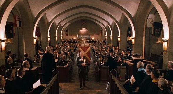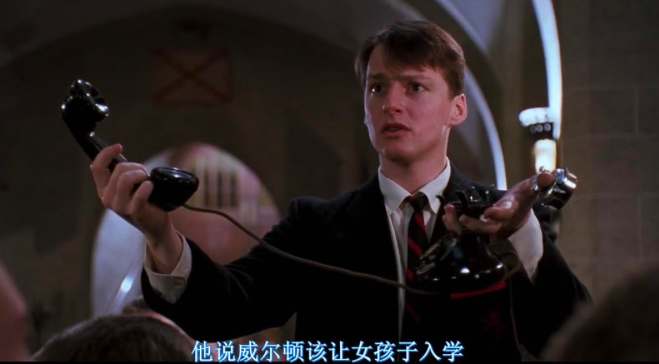 影片开头,学校的开学典礼中伴随着一段苏格兰风笛,庄重而压抑的氛围是奠定了整部电影的基调。学生们在庄严的礼堂中一起朗诵者校训:传统、荣誉、纪律、优秀。整个过程庄严肃穆,也显得深沉而凝重。