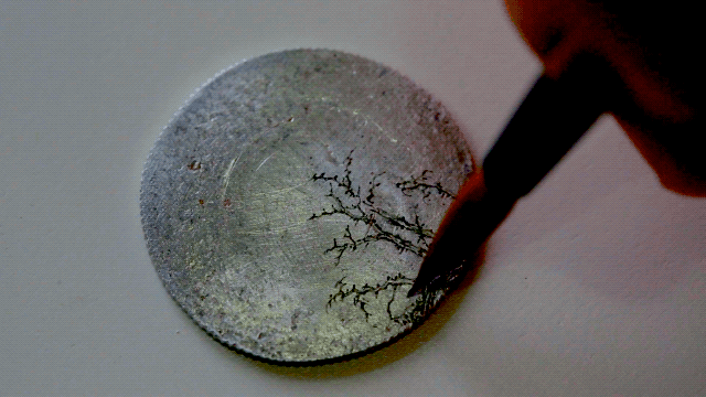 他掏出几块硬币,用铁锤一点一点地把它们砸平,货币的附加值在过程中一点点被抹去,然后在一两厘米的金属片上面重新画出一张微型的绘画,从而产生出艺术的附加值。倪有鱼戏言,这是真正践行了“砸钱做艺术”。