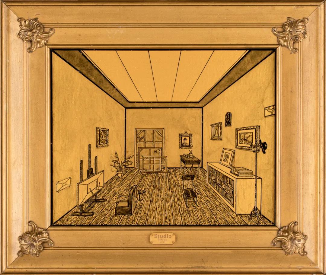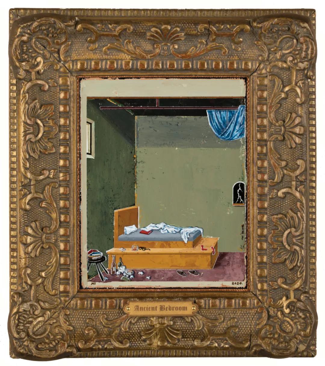 新系列的绘画,是在一批从欧洲各地收集来的的古董画框里描绘的无人空间。他觉得每一个空的古董画框都像是一个带有焦点透视的空房间,几百年过去了,原本的画心迭散,他的新作就是将这些空间重新填充回来。画的内容十分应景:卧室、餐厅、床、工作室……各种各样的室内空间,是过去一年疫情里,全球人民待的最多的地方。