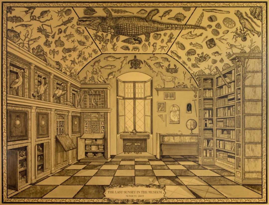 目前最大的一幅《博物馆的余晖》,用时超过半年。画面主体来源于1599年的意大利,人类历史上最早的私人博物馆的一幅古版画。他把陈列架上的物件,换成了自己的作品,“完成之后的水冲绘画,就像把一种残留的余晖凝固下来。”