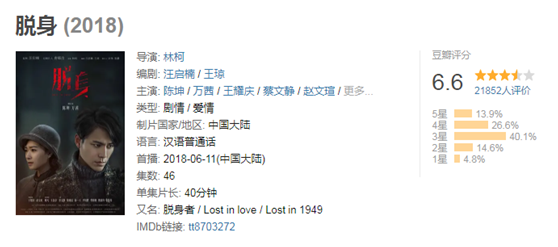 2018年,主演的电视剧《脱身》收视率差点跌破0.7。