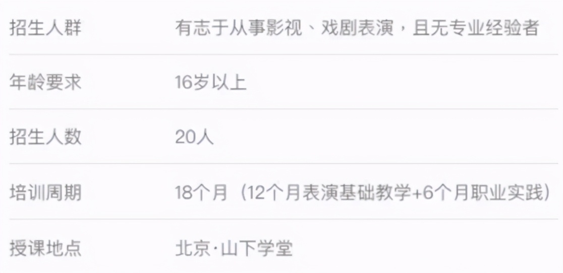 开班教学收学费,学费分为两档,低档是针对无表演经验的人群,目前官网的报价单上显示学费标准是120000一期不包住宿和餐食,一期为18个月,其中一年是基础课程,半年是职业实践。