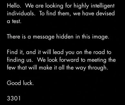 2012年1月4日,在4chan网站上出现了一个奇怪的帖子,帖子里只有一张图片。图片上的文字说,有人正在寻找世界上最聪慧的人,他们在图中留下了信息,顺着信息就可以找到发帖者,署名为3301。
