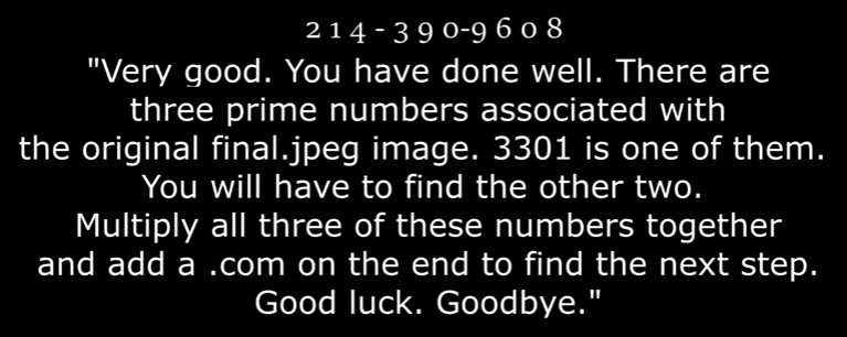 是一个电话号码,拨打后,会被告知第一幅画有三个素数,将其相乘后会得到一个网站。