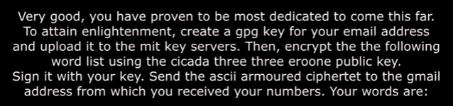 第二年的同一时刻,新一轮解密活动又被发起了。到2014年,总共发起了三次。每一次都是极其隐晦的线索和层层嵌套的密码,不知难倒多少英雄好汉倒。参与或者旁观了这些活动的网友,一致评价其为“互联网时代最复杂和最神秘的谜题”。《华盛顿邮报》更是称它为“互联网最可怕的未解之谜”。谁也不知道三次活动下来,有多少人坚持到了最后,又有多少人被他们招募了进去;更重要的是,他们是谁?