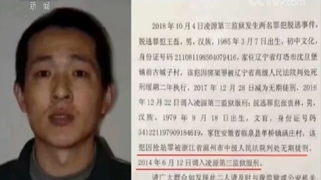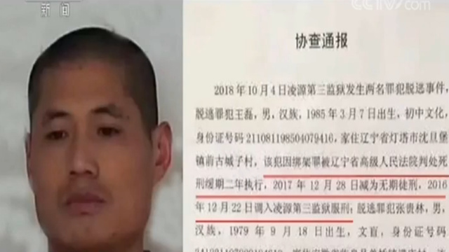 逃脱案件发生后,凌源第三监狱于10月4日当天发布协查通报。通报显示,脱逃罪犯王磊,是因绑架罪被辽宁省高级人民法院判处死刑缓期二年执行,2017年12月28日减为无期徒刑,2016年12月22日调入凌源第三监狱服刑;脱逃罪犯张贵林因抢劫罪被浙江省温州市中级人民法院判处无期徒刑。2014年6月12日调入凌源第三监狱服刑。