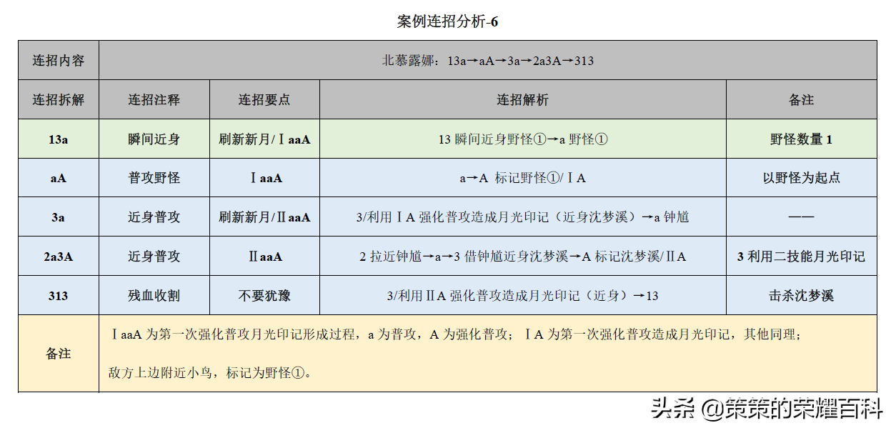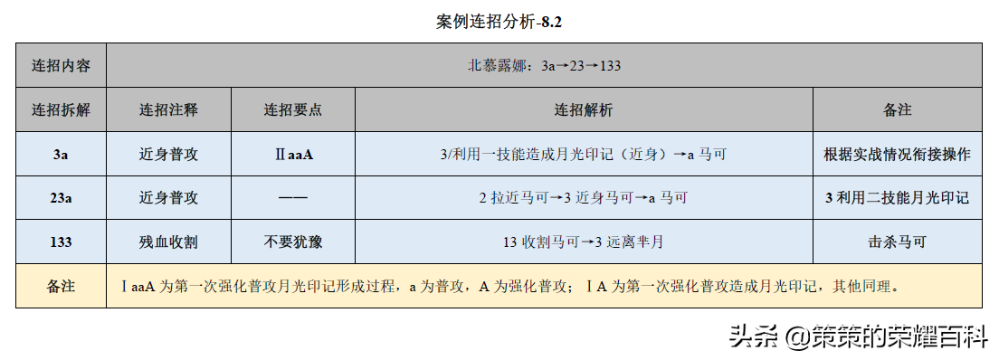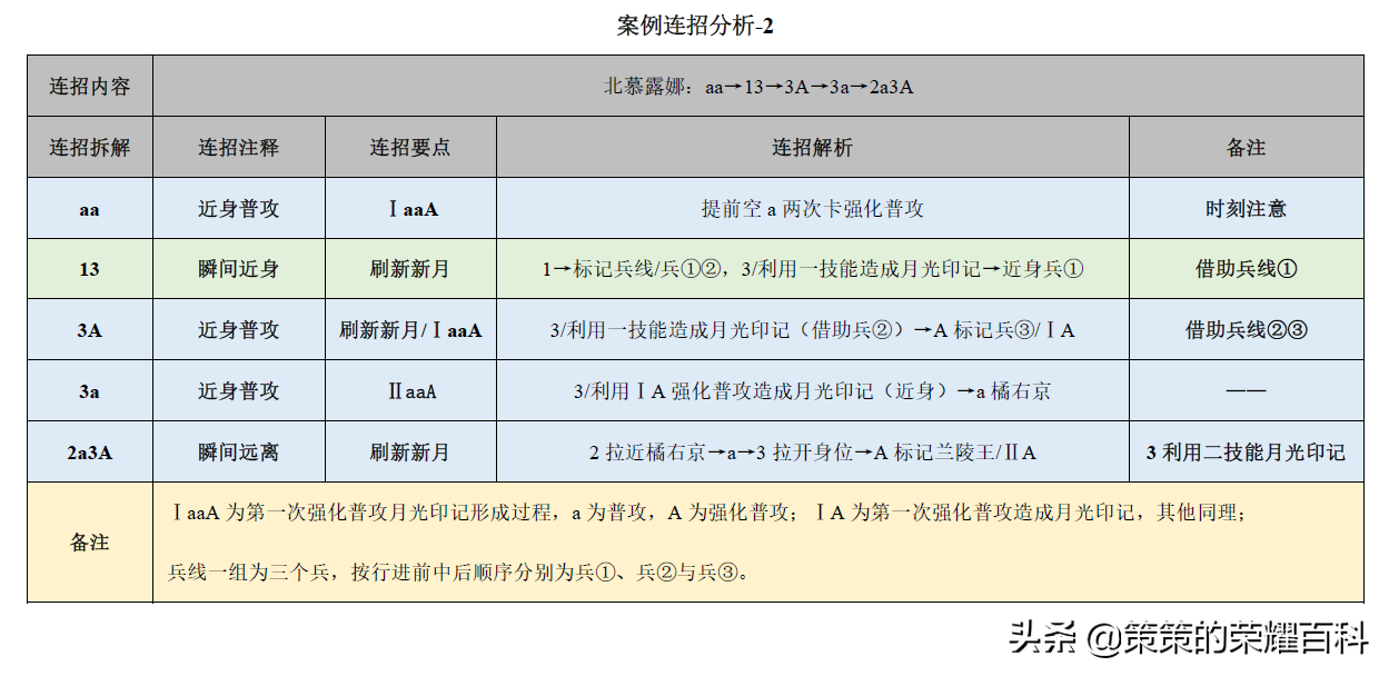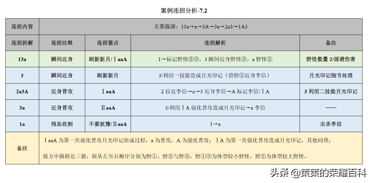 露娜通常操作衔接为,2a3a,二技能打出控制并衔接一次普攻,随后,三技能通过二技能的标记直接再次近身,衔接普攻标记的同时取消技能后摇,若能根据战场情况提前普攻一次,则为a2a3a,也就是说,新月突袭近身之后敌方单位会再被露娜强化普攻标记。