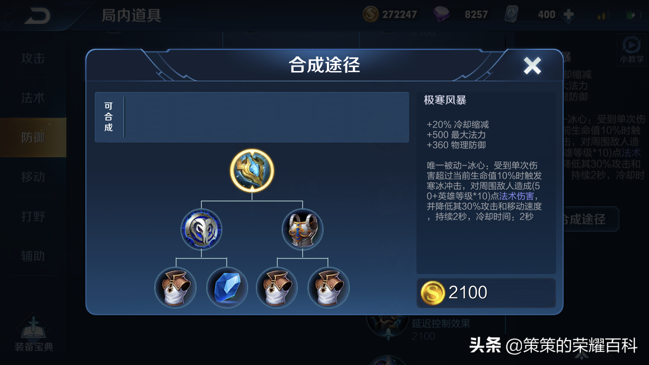 极寒风暴,提供20%冷却、500最大法力与360物抗,被动冰心也十分契合露娜的打法思路,当露娜近身敌方英雄时,倘若单次受到伤害超过当前生命值10%,将对周围敌人造成30%攻击和移速,持续2s,这会使得露娜贴身之后,适当衔接多次普攻。