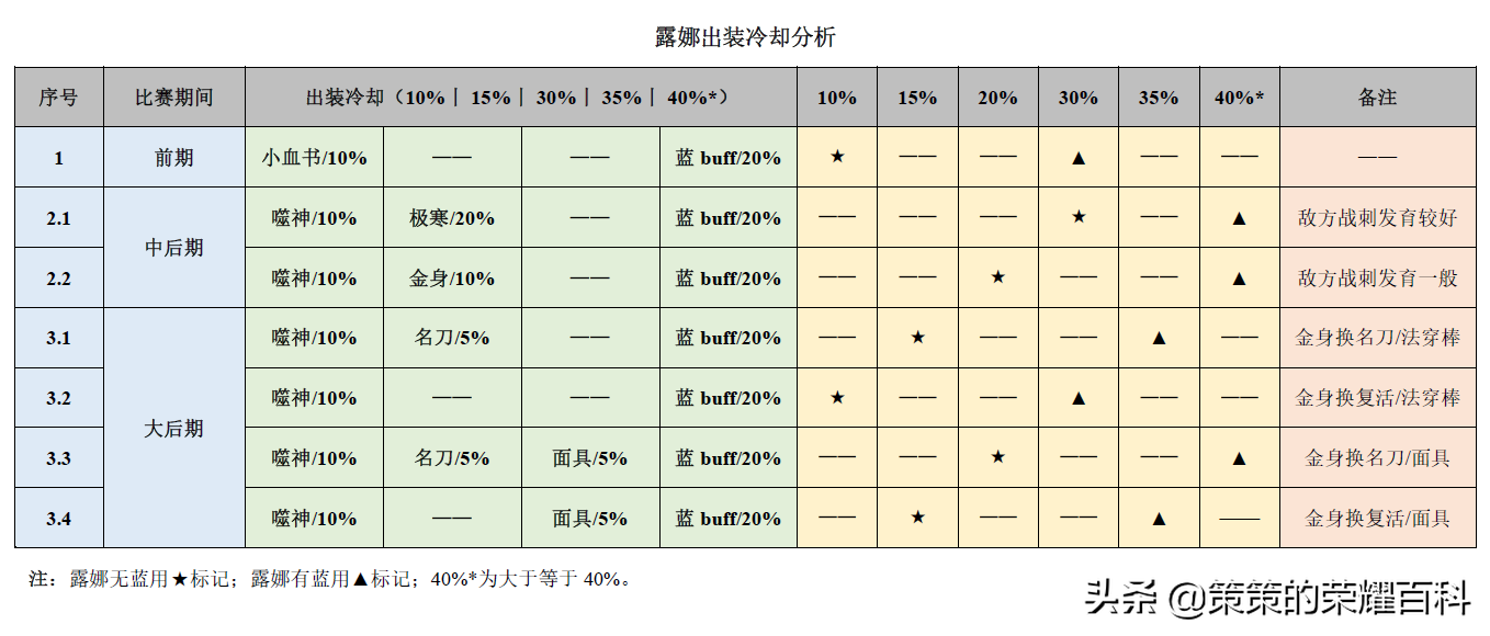 由于露娜不会选择冷却铭文,根据出装属性与控蓝情况,冷却缩减通常为10%、15%、20%、30%、35%与45%。