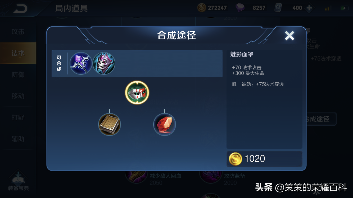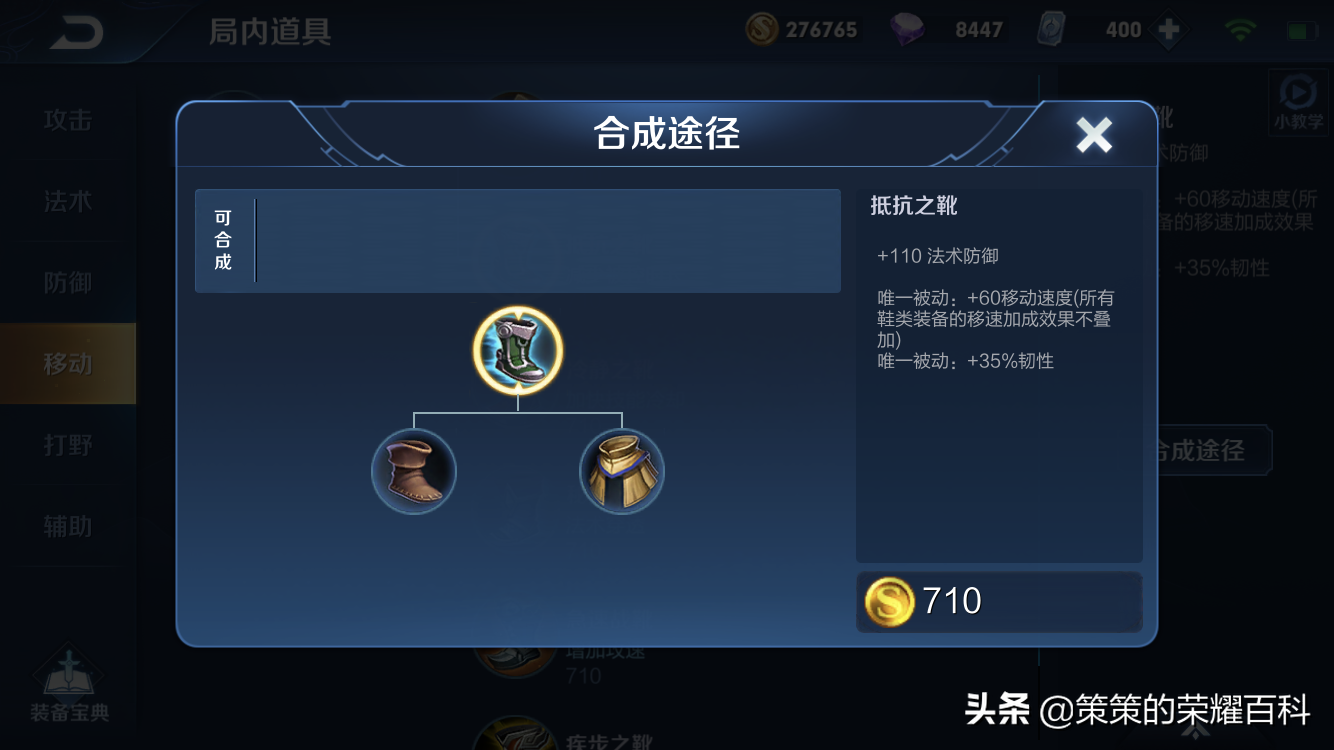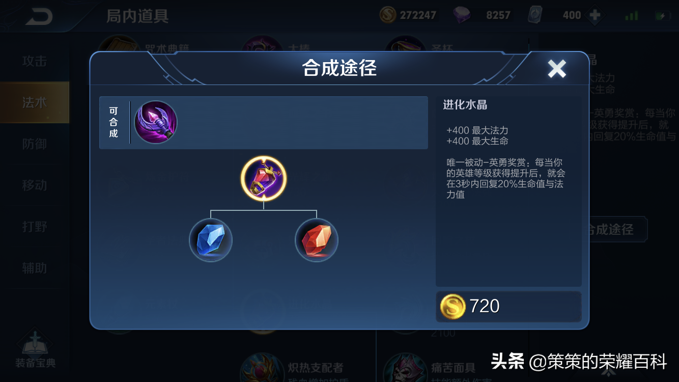 二级蓝刀提供120(6*20)法术攻击,北慕通常会在打野刀之后,先出进化水晶与抵抗鞋,先确保自身的续航与韧性。