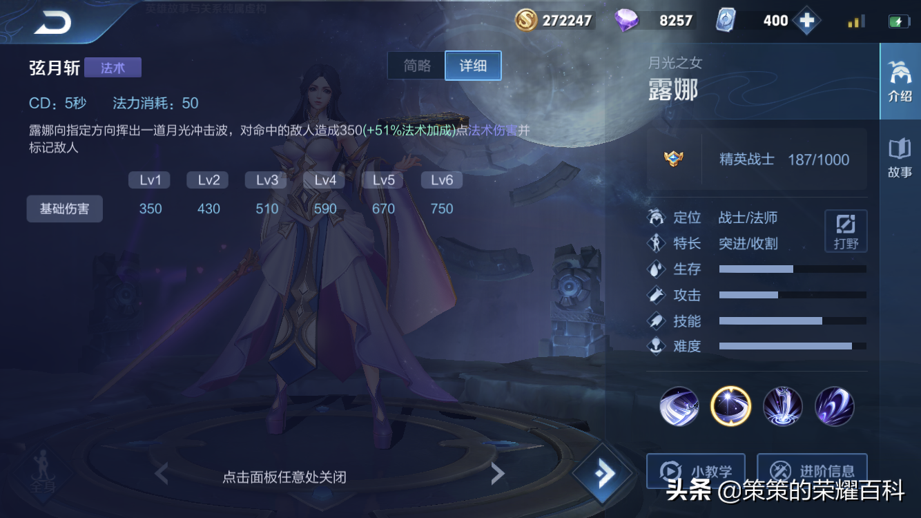 露娜技能均为法术加成,造成法术伤害,二技能护盾加成比例相对较高。