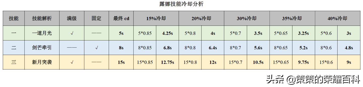 露娜在满冷却40%即有蓝情况下,一技能冷却为3s,二技能冷却为4.8s,而三技能冷却为9s,在比赛后期,露娜三个技能cd相对较短。