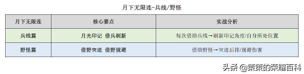 以每一组兵线为例,即前排兵、中间兵与后排兵,当露娜范围标记这组兵线时,会产生三个月光印记,露娜则可以借助这组兵线刷新三次大招,也就是说,露娜有三次机会调整自己位置,进场亦或撤离。