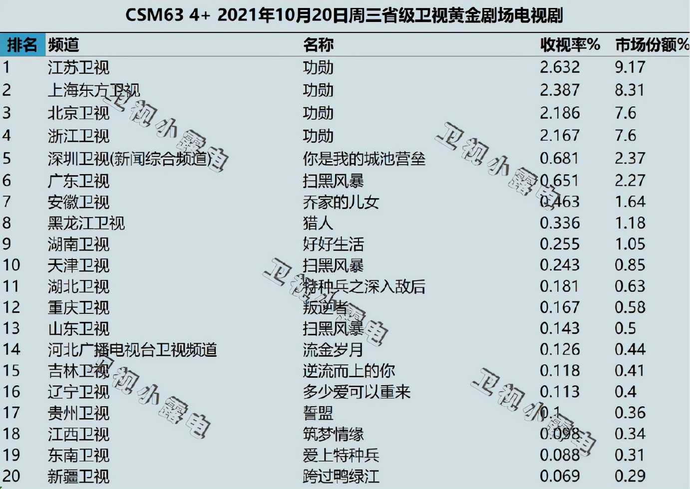 电视剧出现了少见“四台联播”的情形,而且这4个电视台包揽了所有电视台收视率榜单的前4名,这相当于所有的观众,几乎有一半的观众都在看《功勋》这部电视剧。