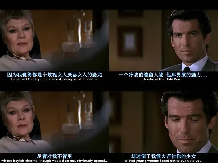 但由于上世纪90年代雄性气概已经开始被视为批判对象,即当下西方所谓的“有毒的阳刚”(toxic masculinity),布鲁斯南的邦德《黄金眼》中甫一出场,便遭到女上司m(英国最有名的戏精朱迪·丹奇扮演)一顿痛斥:“你这个性别歧视、厌女的恐龙!冷战的残余!”